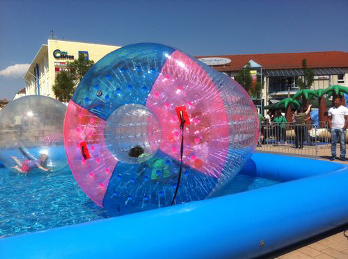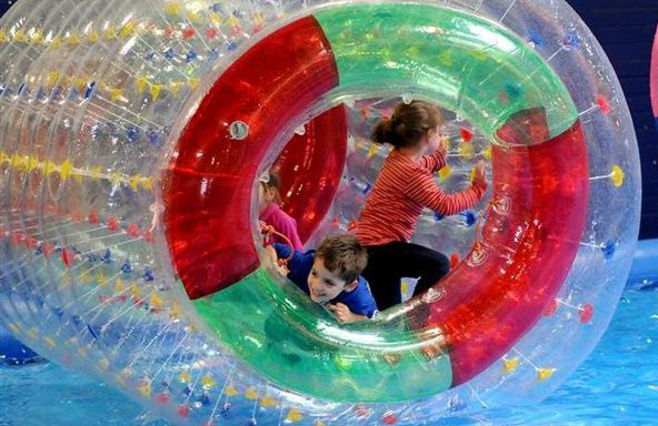Bei unseren Wasserrollen können jeweils bis zu 3 Personen gleichzeitig, „trockenen Fußes“ über das Wasser laufen.