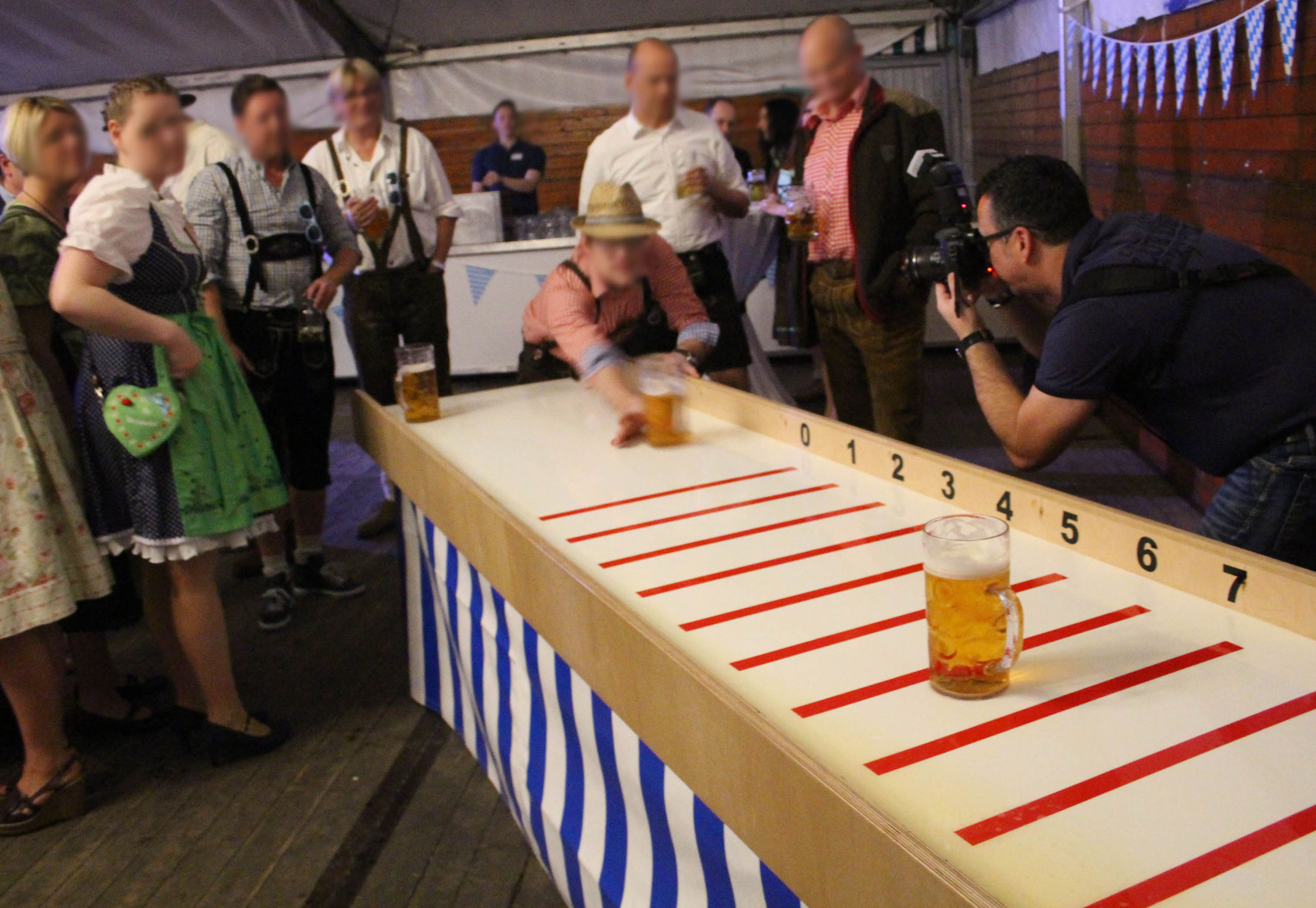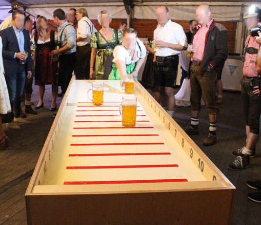 Bei dieser Variante werden dazu befüllte Maßkrüge über eine drei Meter lange Bahn geschoben.