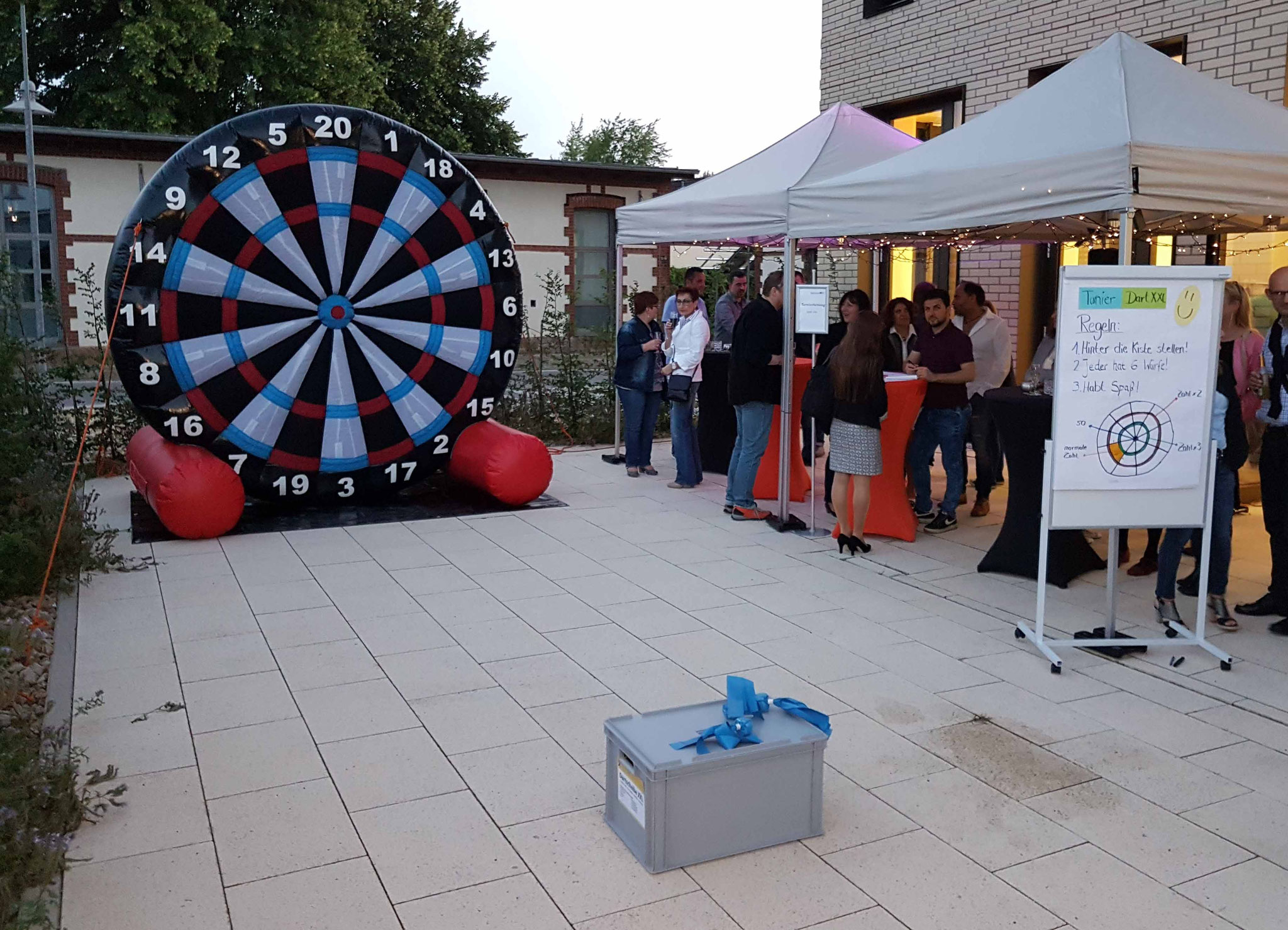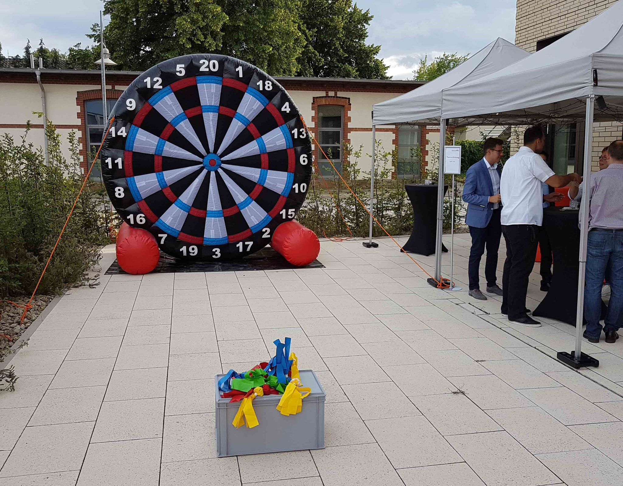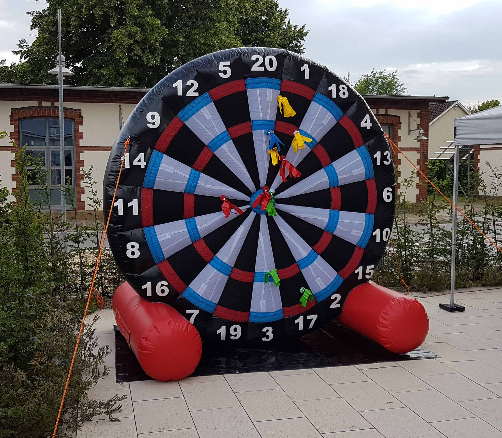 Spielprinzip wie bei einer normalen Dartscheibe, nur dass unsere 3m Durchmesser hat und man aus 5-15m Entfernung wirft.