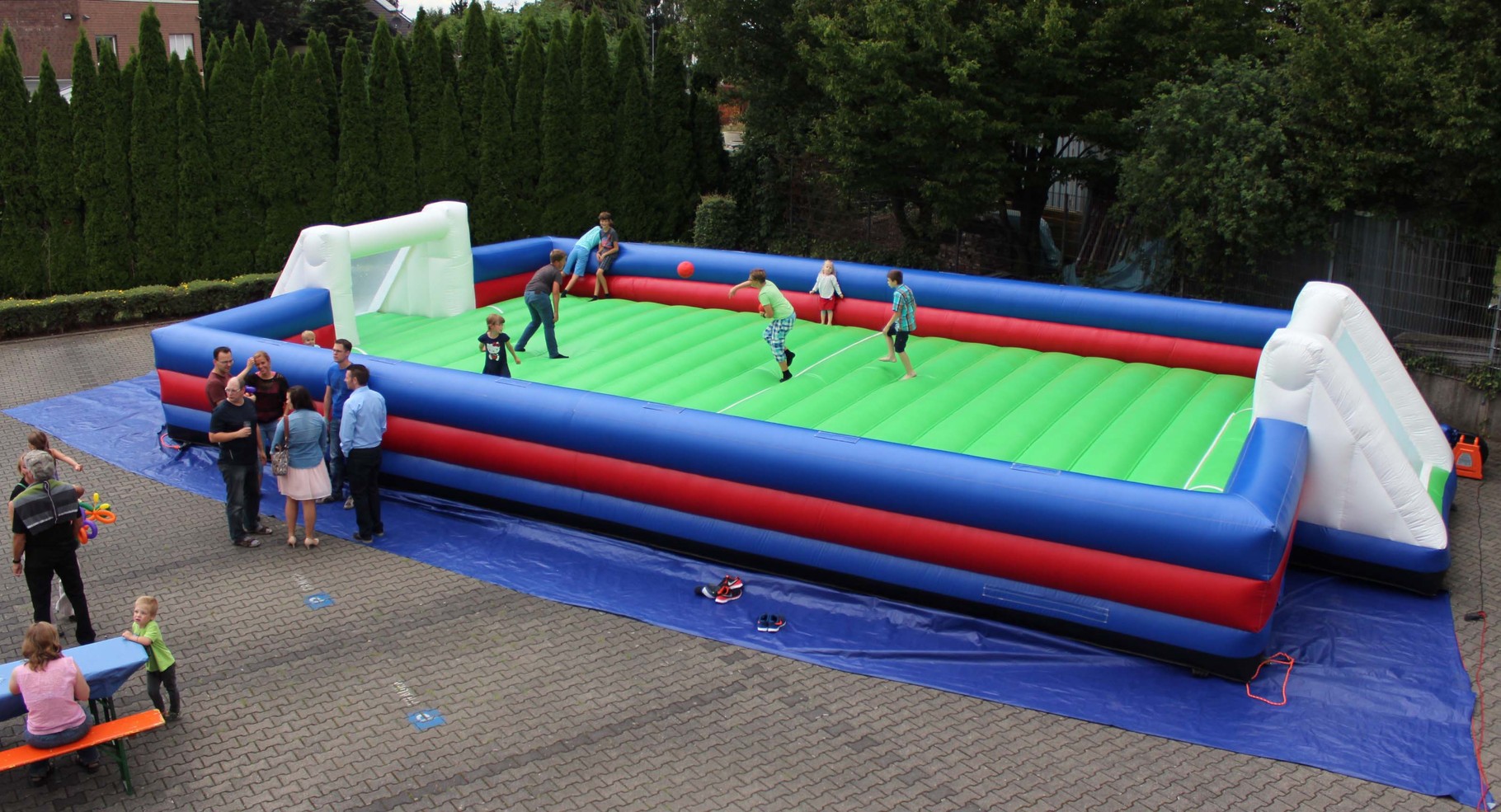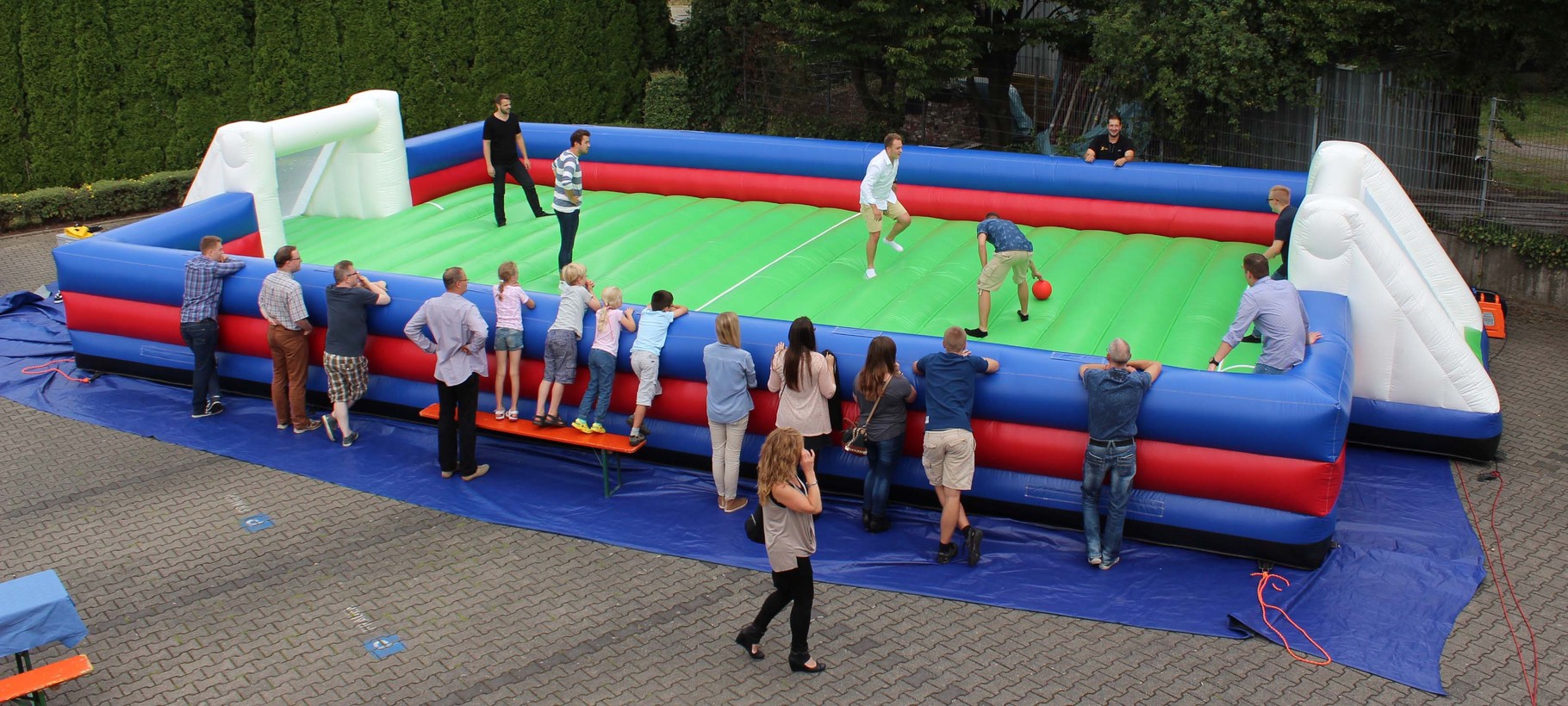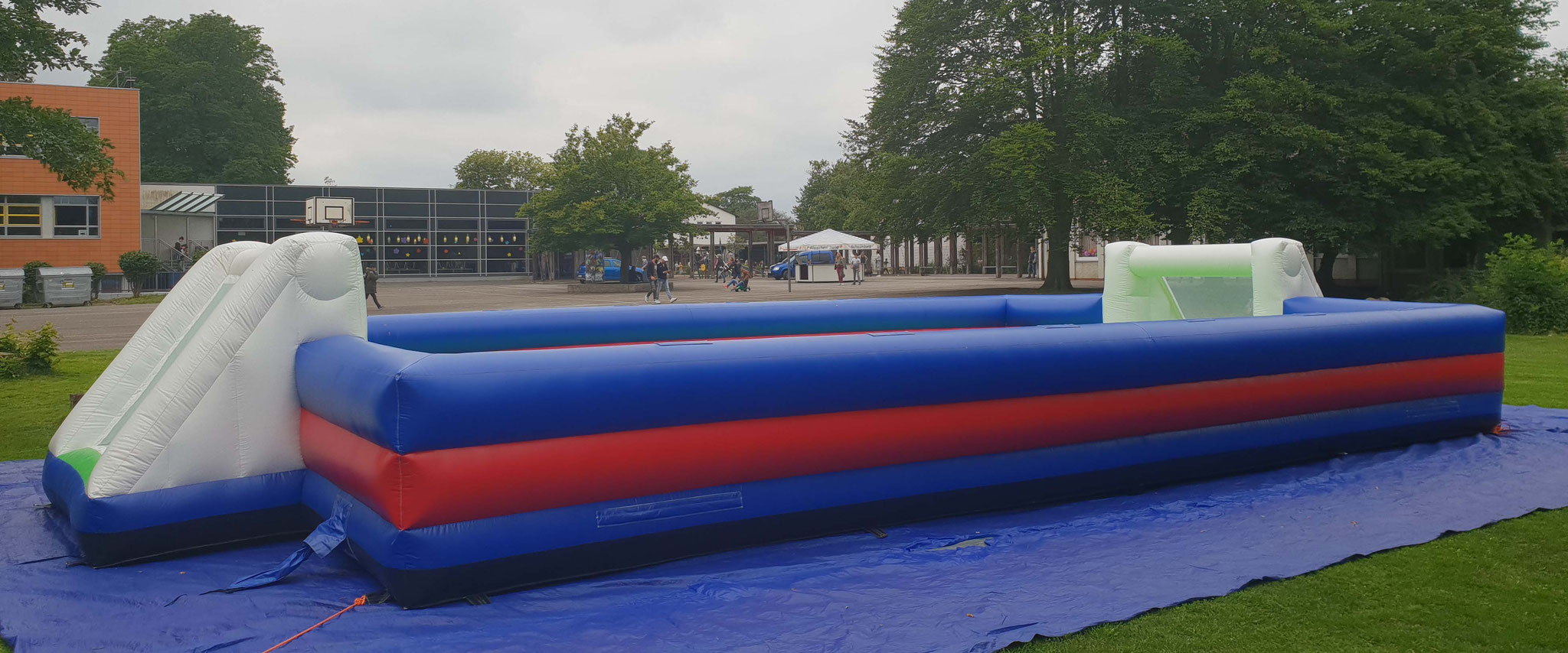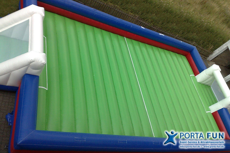 Zwei Mannschaften mit jeweils ca. 3 Spielern können sich auf dem großen aufgeblasenen Fußballfeld frei bewegen.