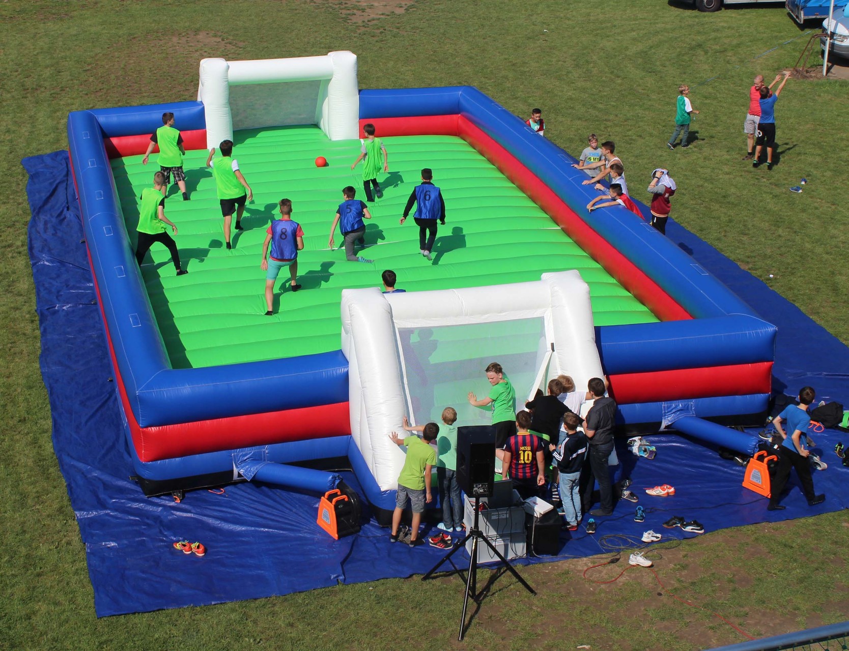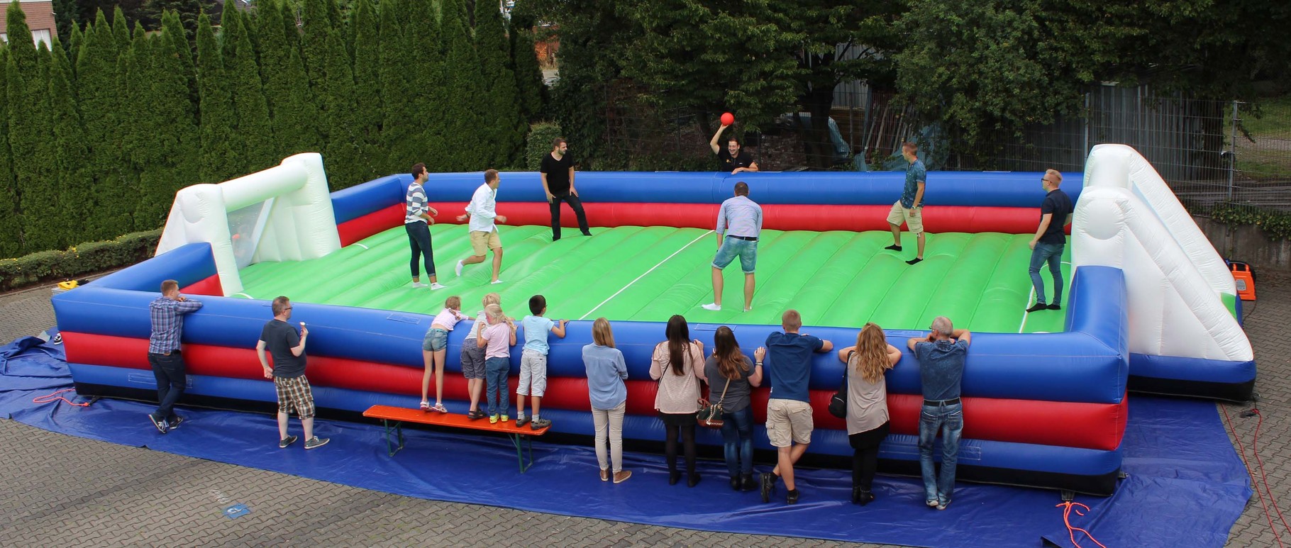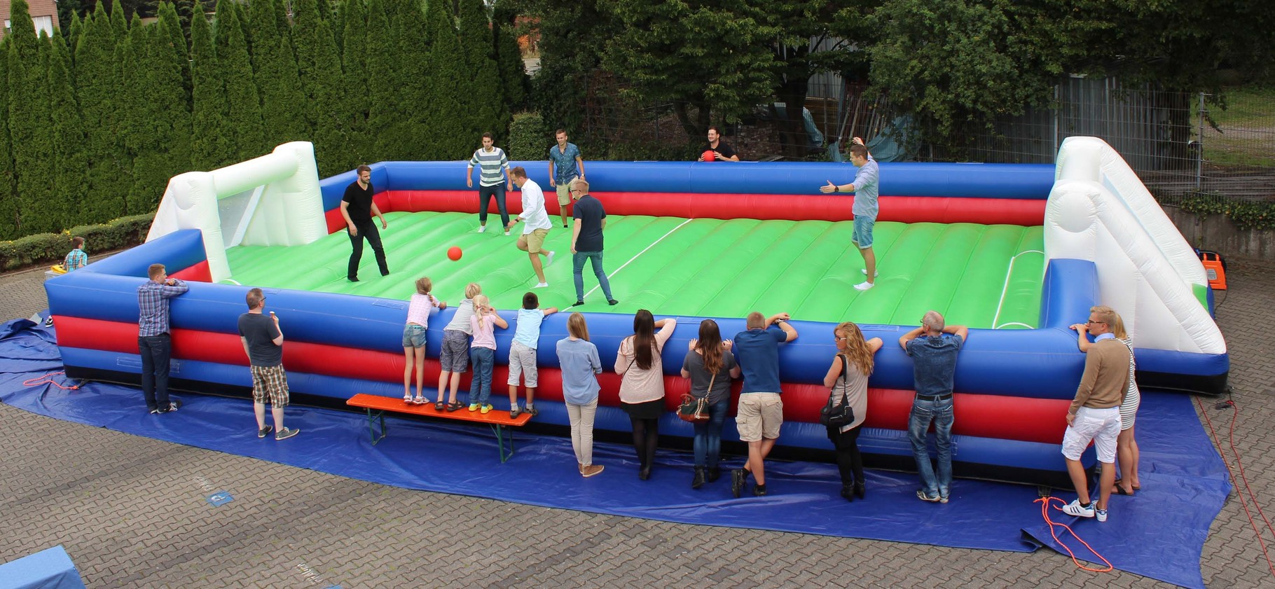 Zwei Mannschaften mit jeweils ca. 3 Spielern können sich auf dem großen aufgeblasenen Fußballfeld frei bewegen.